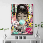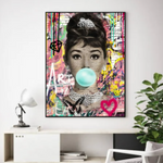 . Le détail qui fait la différence ? Audrey est en train de gonfler un chewing-gum bleu clair, un élément fun et inattendu qui apporte une touche d’humour et de modernité à l’œuvre.